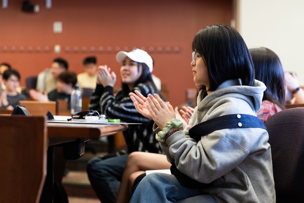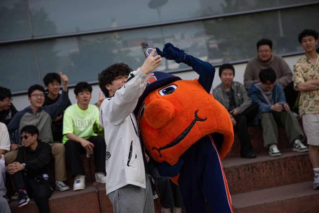 An iY-1 student takes a photo with Otto at the May 2024 orientation.